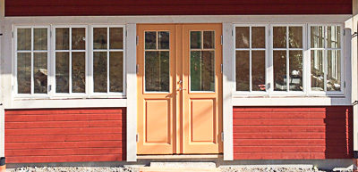 Fönster 1+1-glas med kulturprofil och med spröjs i både inner och ytterbåge. Pardörr PD22 dörrförslag 107 spröjs 1:1 upp.